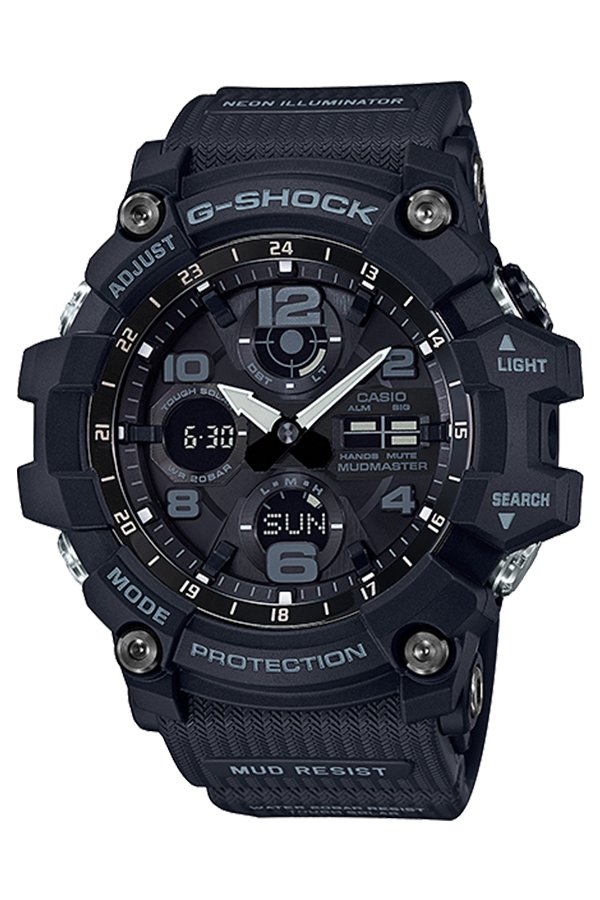 A model fitted with the dust-proof, mud-proof structure from the Master of G MUDMASTER series, which is intended for extreme on-land use in terrains strewn with rocks, sand, and debris. In order to support use in harsh environments, the buttons have a cylindrical button guard structure that makes them dust- and mud-proof. Cylindrical pipes protect the buttons, and gaskets inside the buttons keep out fine sand and mud. Additionally, the cylinder pipes play a role in alleviating impacts on the buttons and improving their operability, and are designed to withstand tough use. The design expresses the tough image associated with the special vehicles and equipment used in disaster relief. Additionally, wide hour and minute hands and large Arabic numeral indices are used to improve visibility even in harsh conditions. The band has a non-slip texture and designed with a strong military feel throughout.