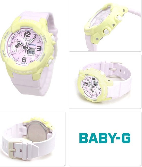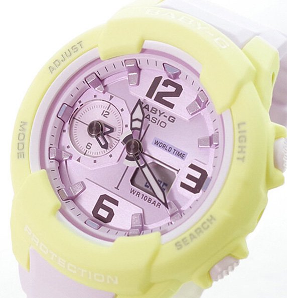 This lineup features five colors: fashionable beige and khaki earth tones, popular white and black, and manly orange. Large, three-dimensional hour numbers improve readability. Dual Dial World Time shows the current time in one other time zone using a small dial at 9 o'clock. This and much more provides plenty of support for the world-traveling woman on the go.