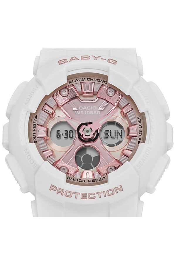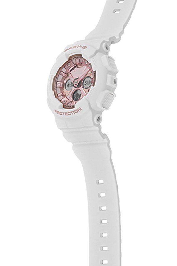 The base model is the BA-130, which is a compact version of the popular G-SHOCK design. The colors of the white and pink models combine with the metallic hues of the face parts for a bright and refreshing look. The refined onetone coloring of the black model creates a cool-looking impression.