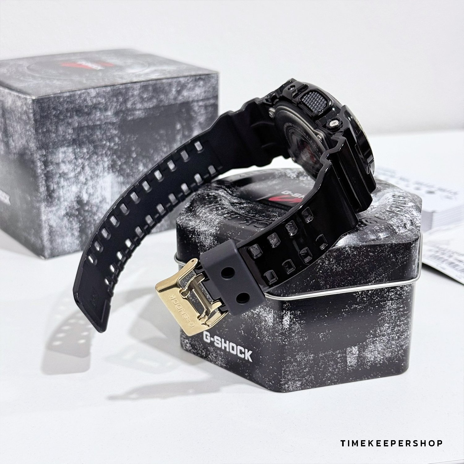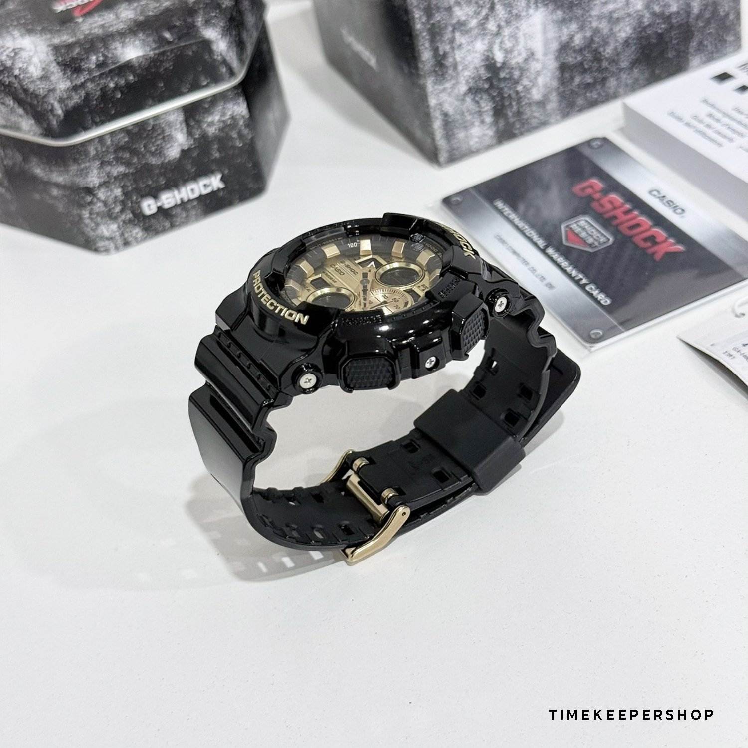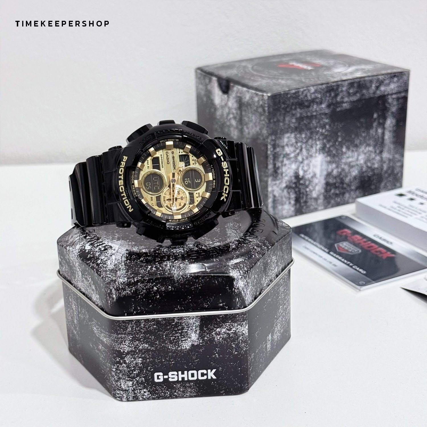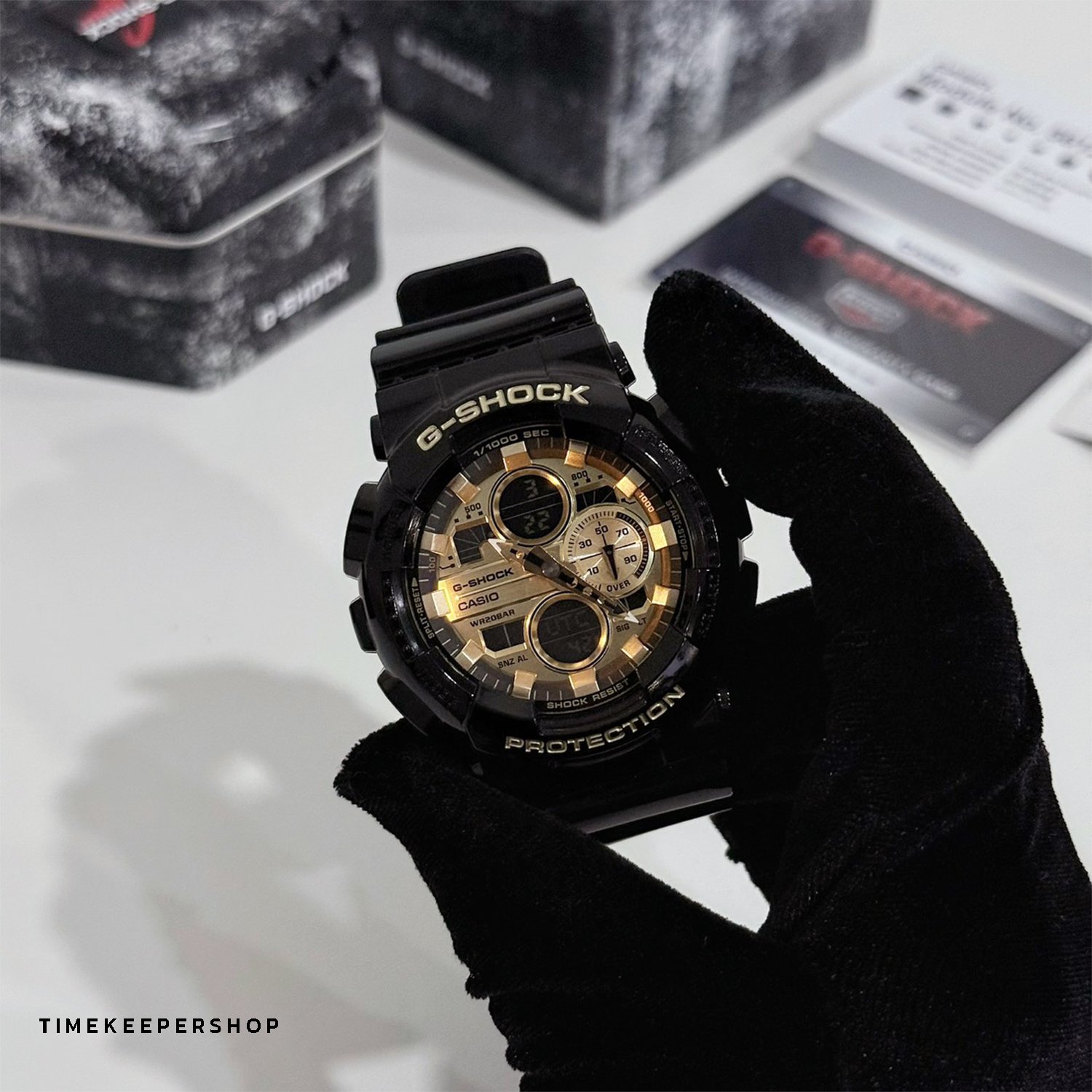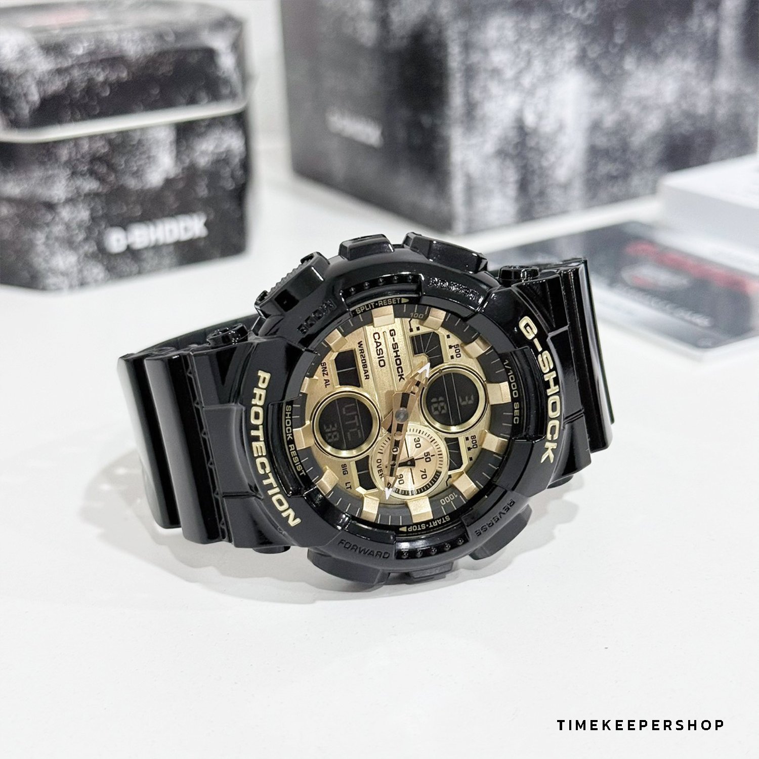 These new models are the latest additions to the G-SHOCK GA-140 Series of digital-analog combination timepieces. The GA-140GB has a glossy black finish and gold highlights.