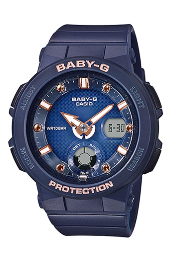 These models are available in a choice of black or navy blue, offset by a seashell motif that reflects sunlight in glittering pink hues. The black model has a pink face and hour markers, while the navy blue model has a navy blue face with pink hour markers. The metallic faces and hour markers reflect light to create a glittering design. The edge of the face uses semi-transparent material that reproduces the look of the ocean's surface, while the hour and minute hands are designed in the image of a boat anchor, further adding to the overall beach activity motif.