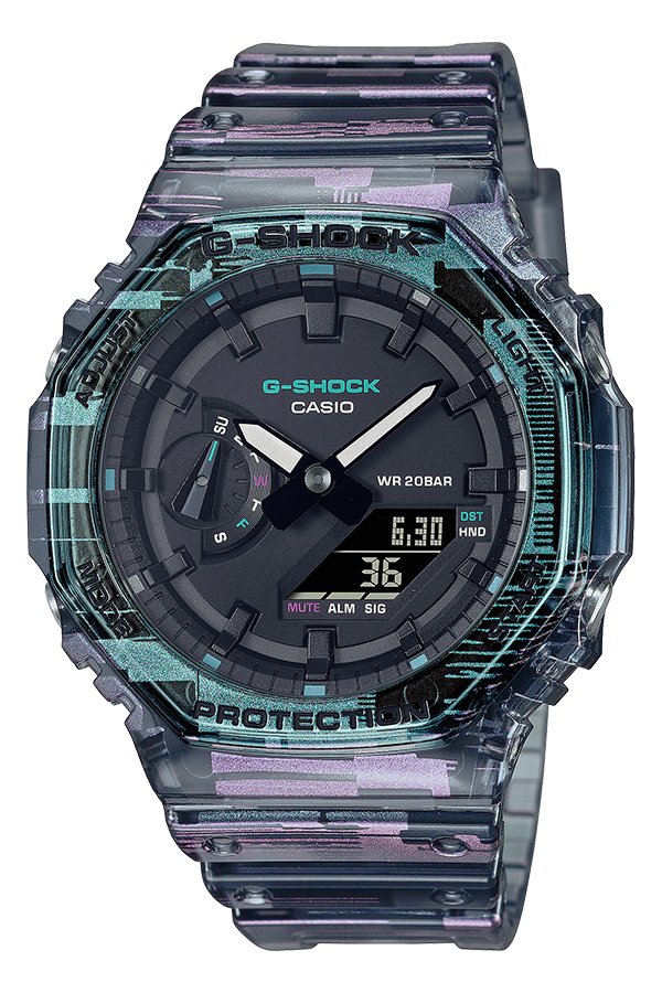 Electrify your style! Introducing a stellar new G-SHOCK in iridescent, digital glitch blazing, multi-angle pattern printing, and translucent resin.