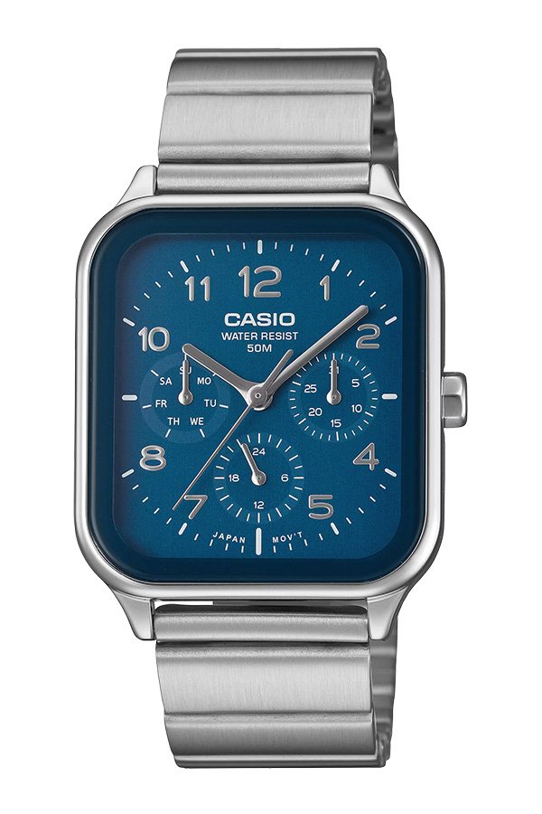 Regular timekeeping: Analog: 3 hands (hour, minute, second), 3 dials (date, day, 24-hour)