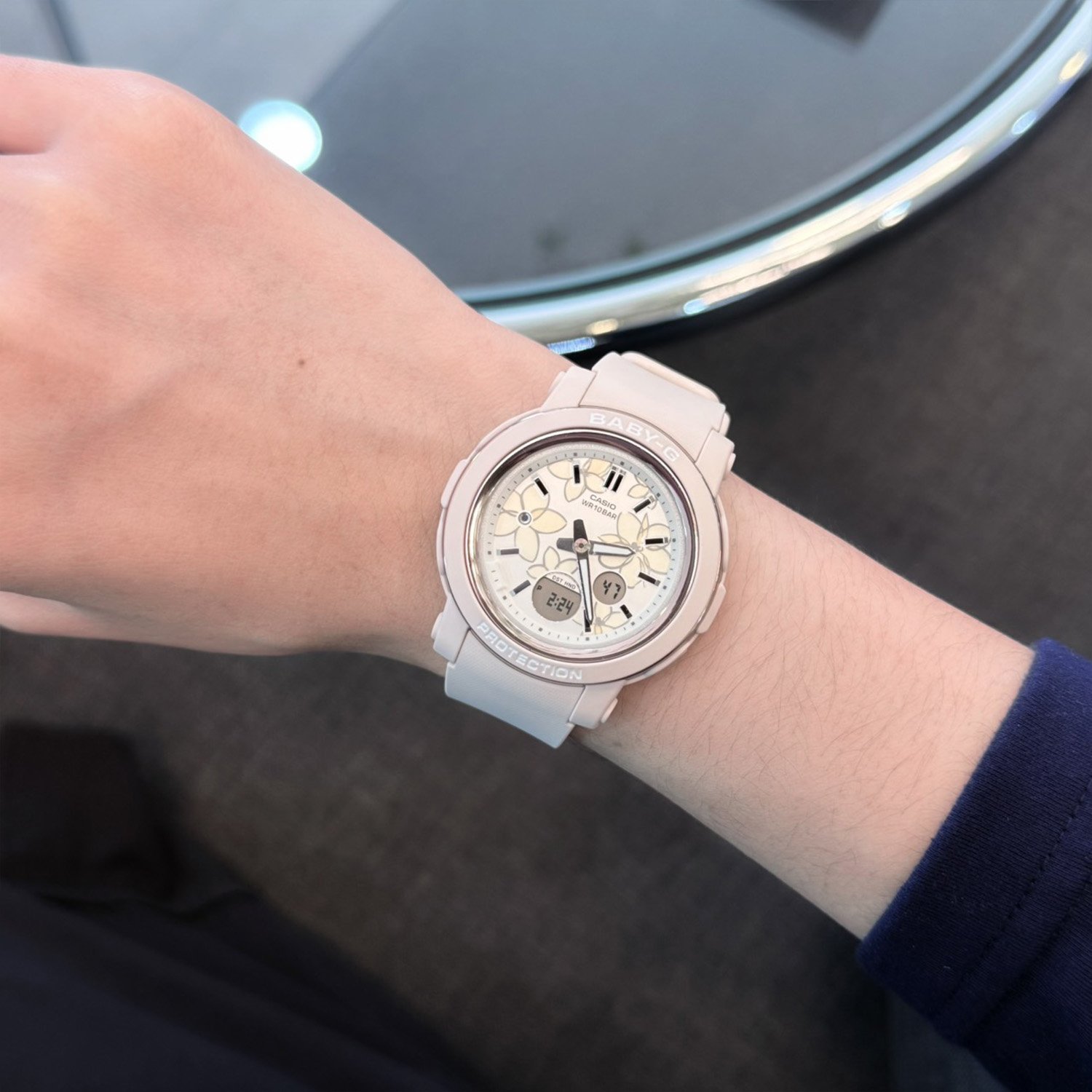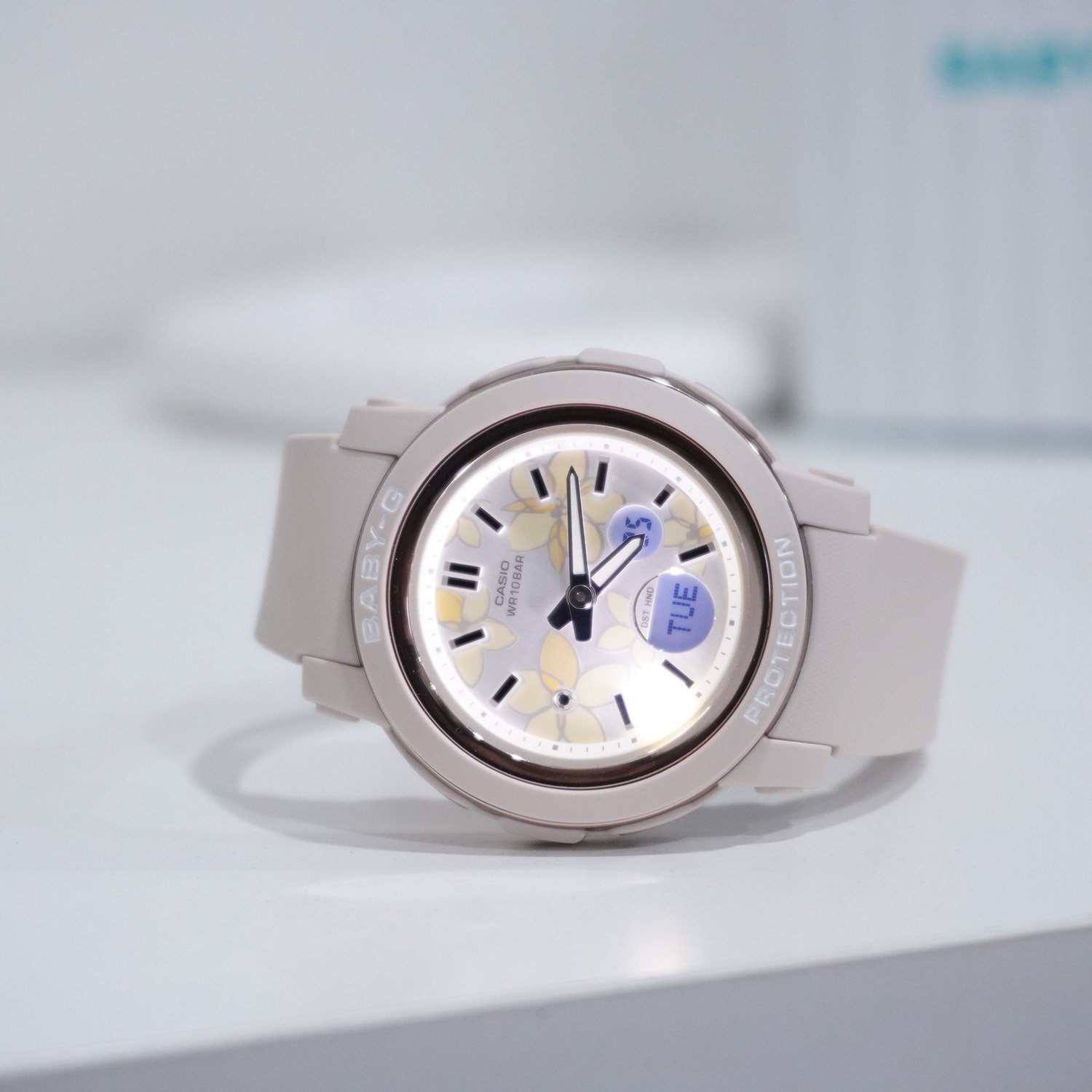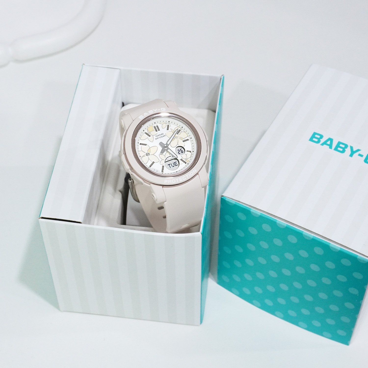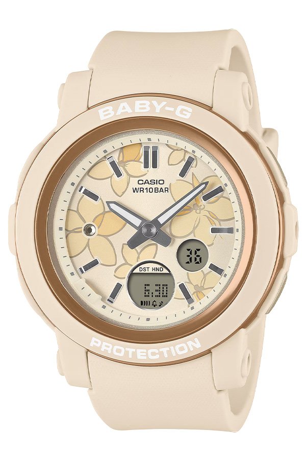 Casually stylish, actively tough — a shock-resistant BABY-G dressed in delicate flowers, pretty and powerful.