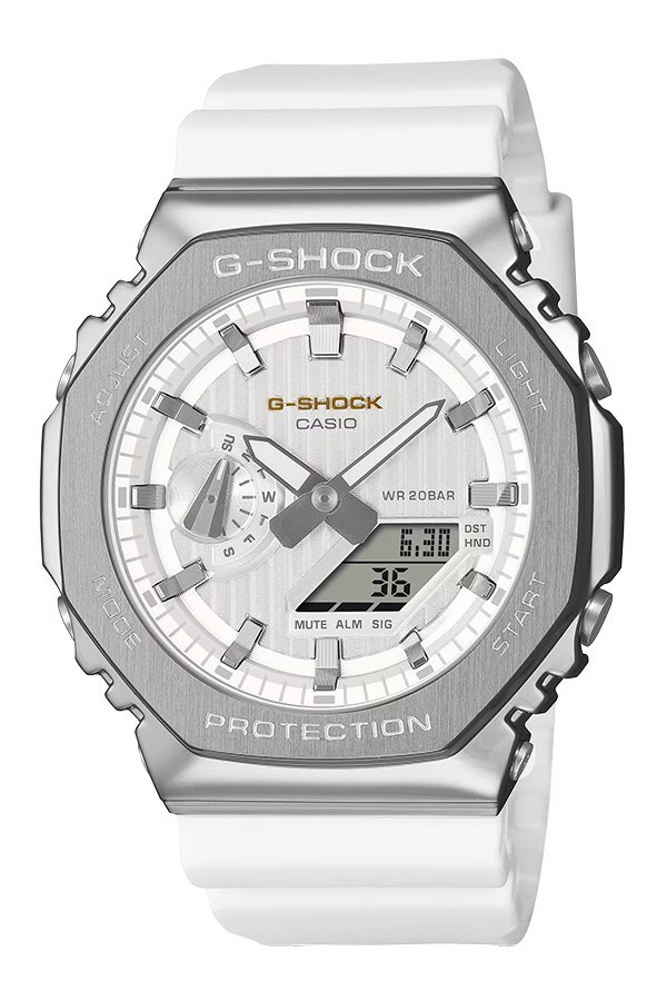 Two pair-perfect sizes from the popular digital-analog 2100 line — the GM-2110SH and GM-S2110SH — feature a dial inspired by the magic of starry skies with metal elements that add shine and texture, and a hairline- and matte-finished bezel and indexes that project poised sophistication. The gold-colored G-SHOCK logo on the dial shines like a star against subtle stripes evoking stardust gently drifting across the sky.