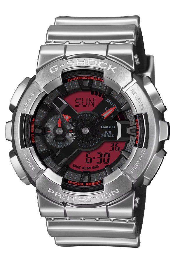 Go metal-clad in fine style — ever-evolving G-SHOCK iconic styles with the metal bezel and bold touches of red loved by trendsetters and athletes the world over.