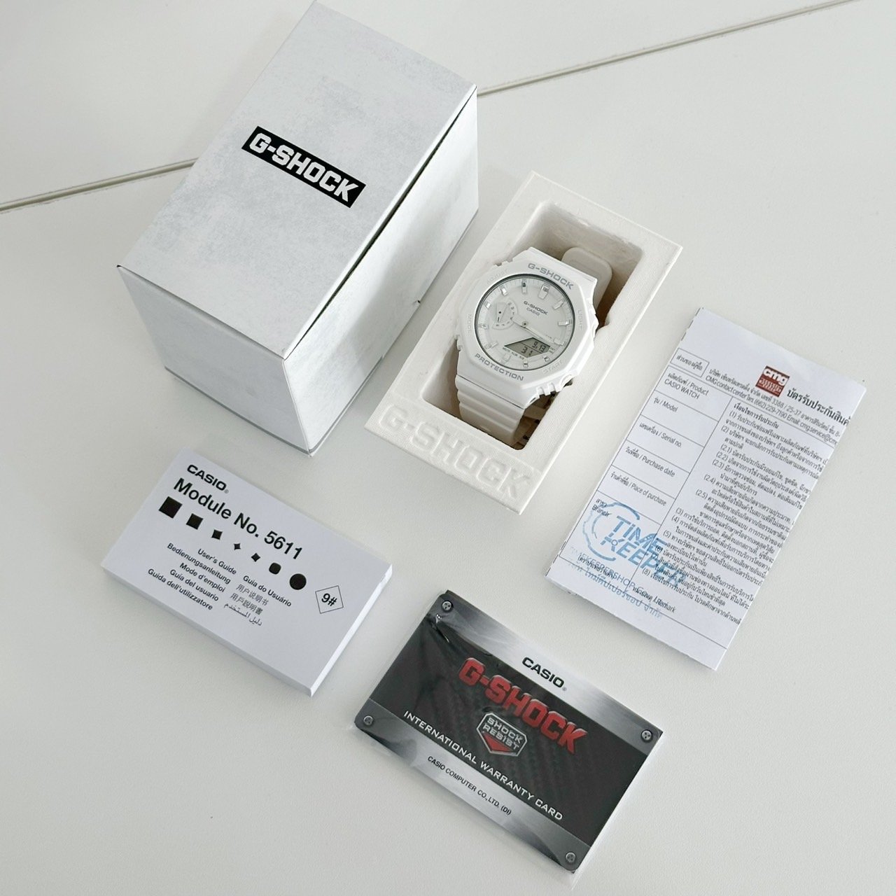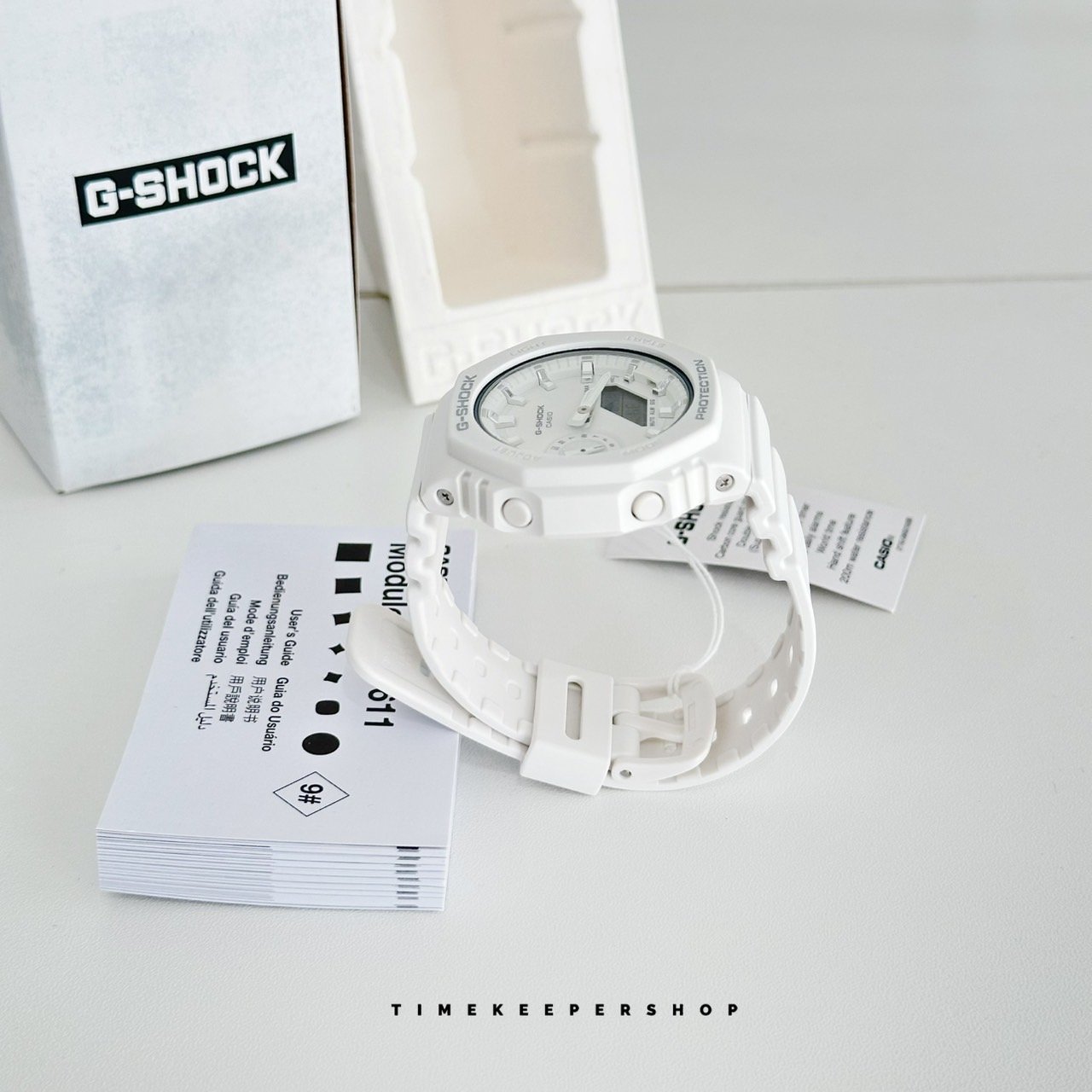 กรอบทรงแปดเหลี่ยม หน้าปัดแบนราบ ตำแหน่งบอกชั่วโมงรูปแท่ง และโครงสร้างป้องกันแกนกลางที่ทำจากคาร์บอนคือลักษณะเด่นของรุ่น GA-2100 ที่มีรูปทรงกะทัดรัด
