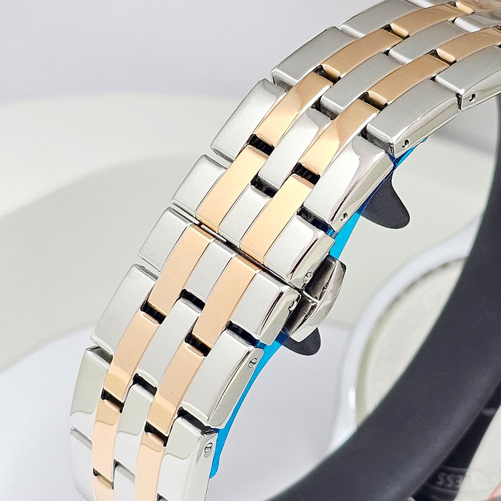 นาฬิกาตัวเรือนและสายชุบเคลือบสีโรสโกลด์บางจุด หน้าปัดสีขาว ประดับคริสตัลรอบตัวเรือน