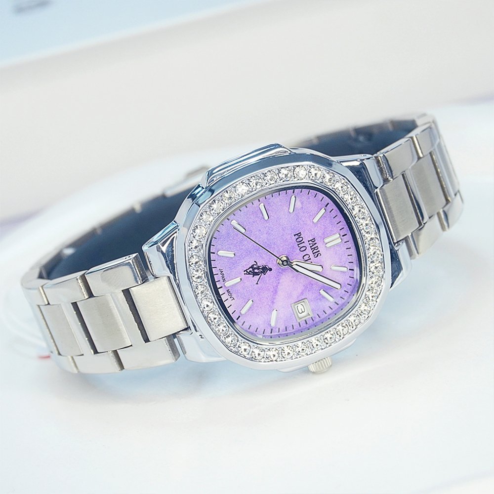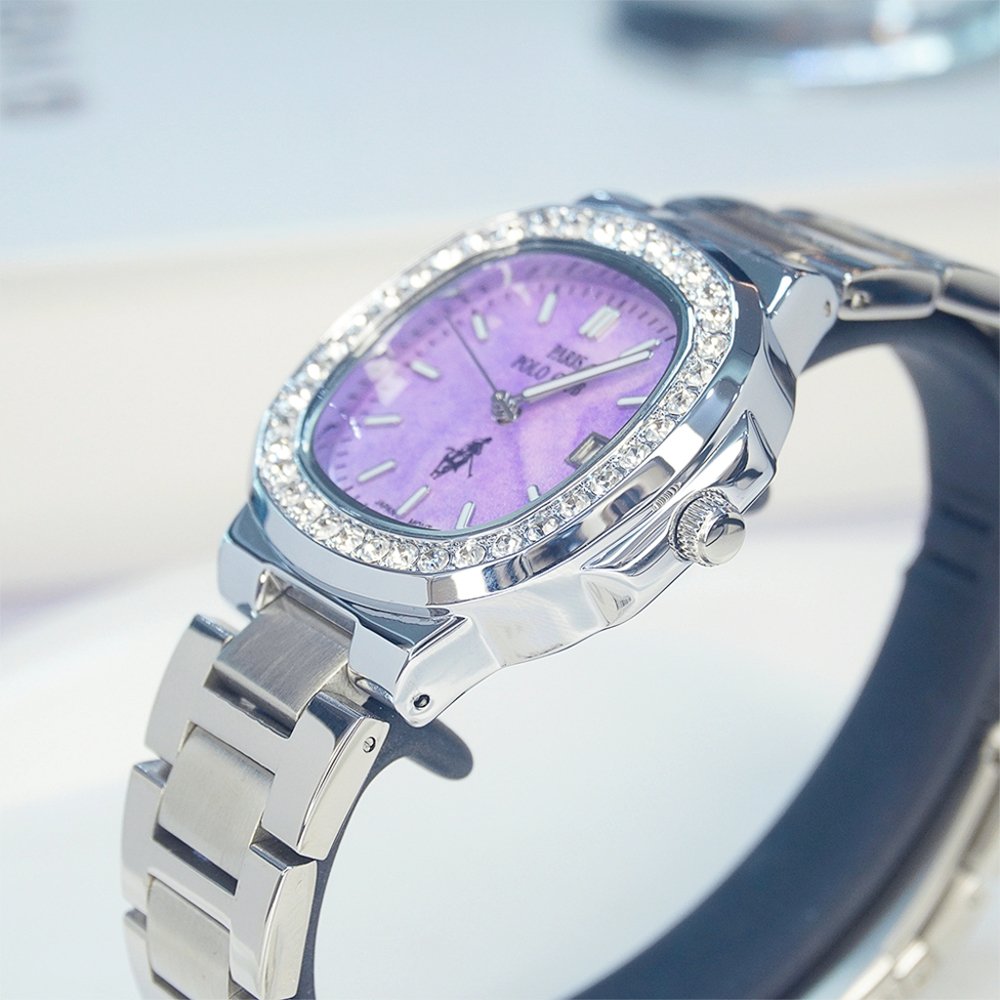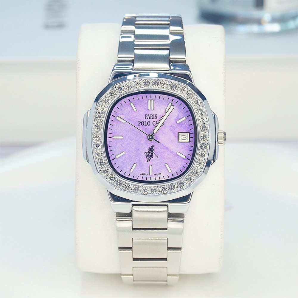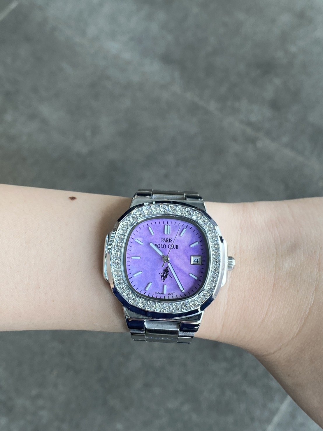 นาฬิกาตัวเรือนและสายสีเงิน หน้าปัดสีม่วงมีลายที่หน้าปัด และประดับคริสตัลรอบตัวหน้าปัด
