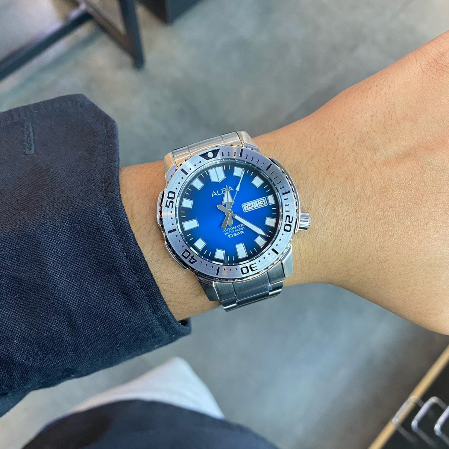 นาฬิกา ALBA Sport Automatic คอลเลกชัน Monster หน้าปัด Sunray ไล่โทนสีสะท้อนแสงสวยงาม Index และเข็มบอกเวลาเรืองแสงด้วย Luminous ขอบตัวเรือนแบบหยักหมุนได้ 2 ทิศทาง บอกเวลา 3 เข็ม พร้อมช่องแสดงวัน และวันที่ ตัวเรือนและสายสแตนเลสสตีล มาพร้อมกับบานพับแบบปลดล็อคด้วยปุ่มกด