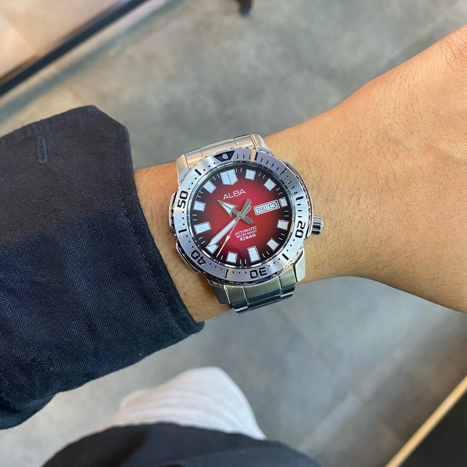 นาฬิกา ALBA Sport Automatic คอลเลกชัน Monster หน้าปัด Sunray ไล่โทนสีสะท้อนแสงสวยงาม Index และเข็มบอกเวลาเรืองแสงด้วย Luminous ขอบตัวเรือนแบบหยักหมุนได้ 2 ทิศทาง บอกเวลา 3 เข็ม พร้อมช่องแสดงวัน และวันที่ ตัวเรือนและสายสแตนเลสสตีล มาพร้อมกับบานพับแบบปลดล็อคด้วยปุ่มกด