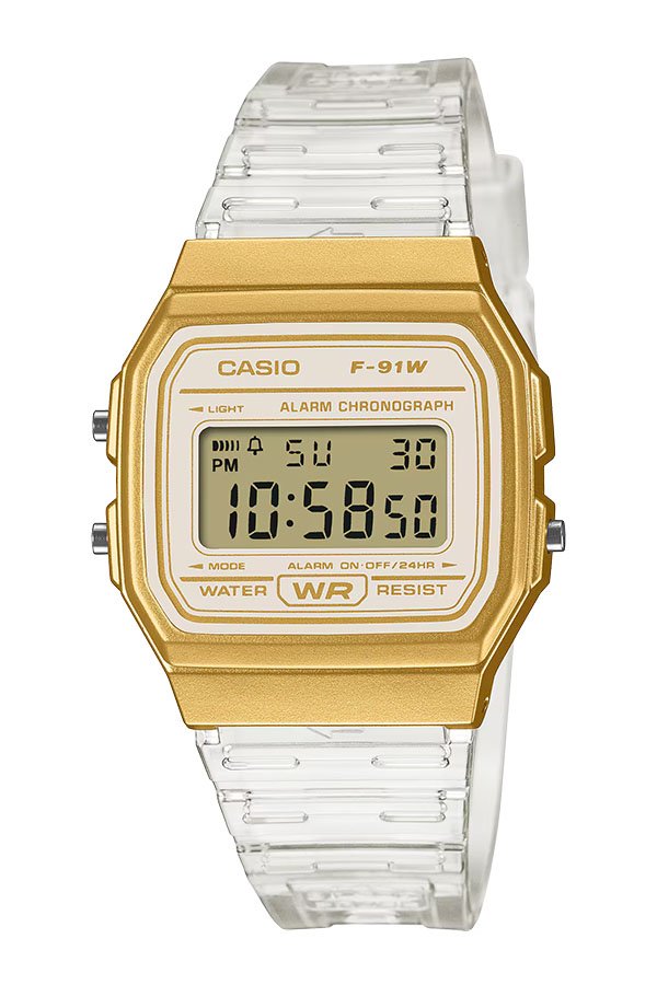 Casio Standard Digital นาฬิกาข้อมือผู้ชาย/ผู้หญิง สายเรซิน รุ่น F-91WS-7A2 - สีทองสายสีใส