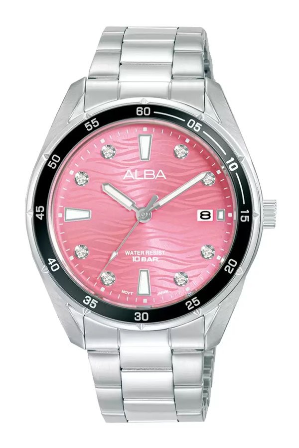ALBA ดีไซน์ หน้าปัดสีชมพู เพิ่มลูกเล่นบนหน้าปัดด้วยลวดลาย Wave Pattern แต่งคริสตัลที่ตำแหน่งบอกชั่วโมง